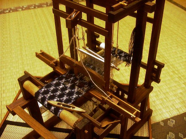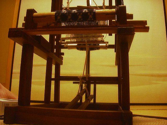 「機織り小屋」を造るまでには、まず「機織り機」を探す事から 始まった訳なんですが、保存状態の良い、理想の機織り機が 中々見つからなくって苦労しました。 結局「愛川繊維会館」(神奈川県 愛甲群愛川町) でお借りしました。ホントに感謝しています。 |