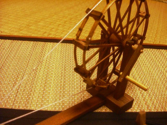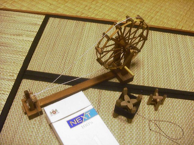 糸車も回ります。ぐるぐる回ります。 この大きい糸車や織り機を作らなかったら、ミニの方は 作れなかったでしょう。作ってヨカッタ! おかげで小さい方の織り機や糸車も きちんと動くものが作れました。 |